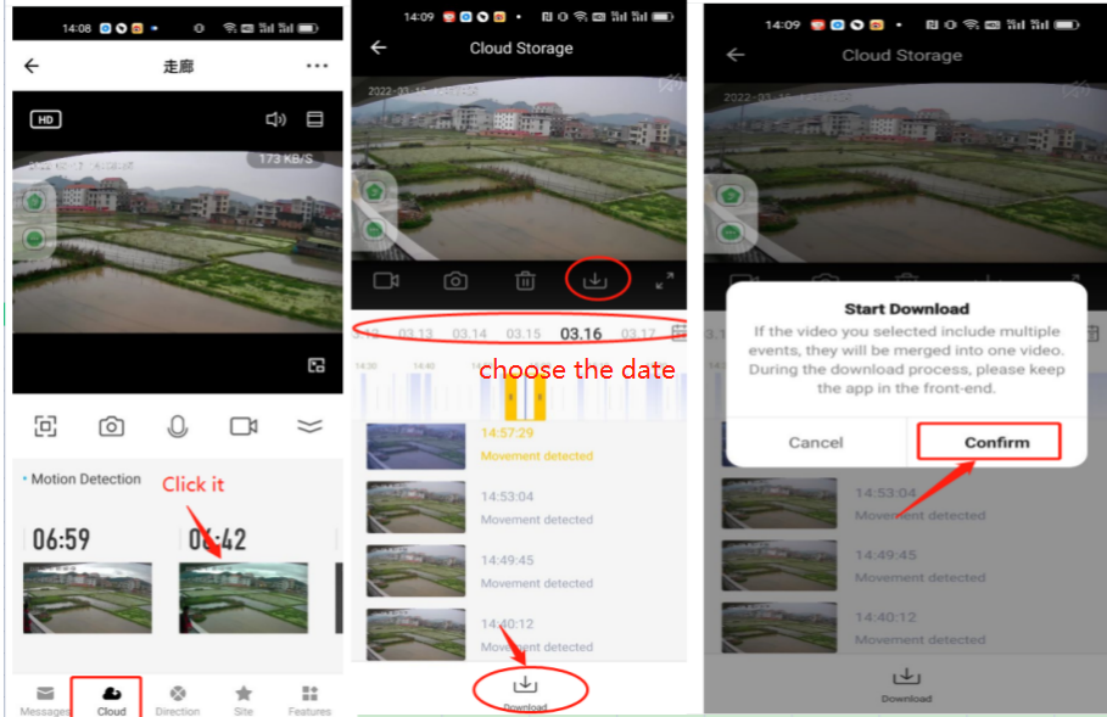 1. Open the APP to enter the live video page 2. Click “Cloud” at the bottom 3. Choose the date you want to download 4. Click the download icon at the bottom 5. Confirm to start the download